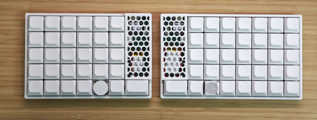 - 右手側に14mmトラックボールを搭載。PMW3610を使用した低消費電力仕様